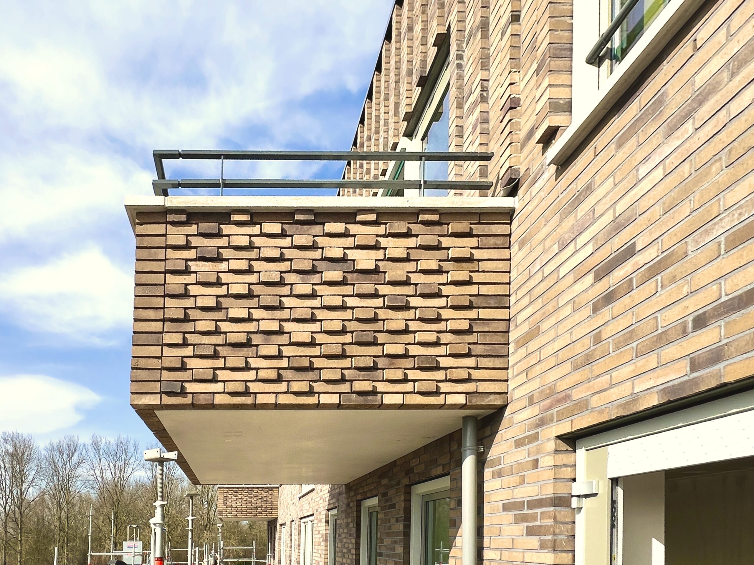 Door het iets grotere programma op de begane grond steken aan de voor- en achterkant 2 volumes uit. Dit was voor ons de aanleiding om hier een afwijkende metselwerkstructuur toe te passen welke ook is doorgezet in de uitkragende balkons. De bovenste verdieping is voorzien van verticale belijning in het metselwerk die als een soort kroon op het gebouw staat. Aan de zijde van de wijkentree (noordzijde) voorzien we in een verbijzondering door middel van een groot overhoeks balkon.